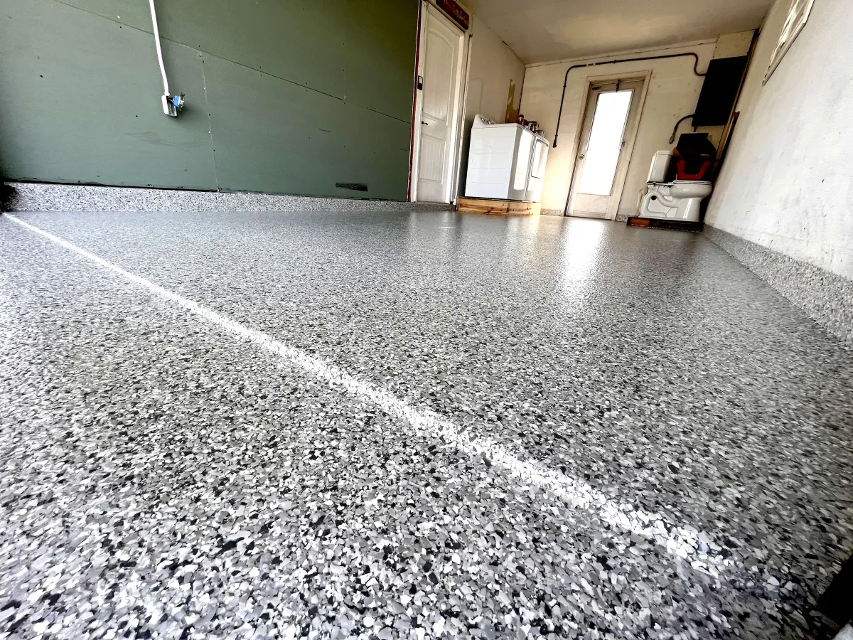 After preparing and potentially restoring your concrete floor, we mix and apply the base coat to it. Right after applying the base coat, we move on to the chips, in order to add color and texture to the floor coating.